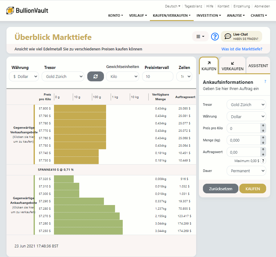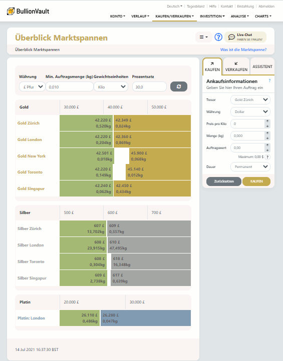 Ein tieferer Markt ist ein Markt, auf dem Sie mehr Edelmetall kaufen oder verkaufen können. Je länger die gelbe Zeilen, desto mehr Gold steht zum Kauf zur Verfügung (für Silber steht die dunkelgraue Zeile, für Platinum die blue und für Palladium die violette). Nach dem gleichen Prinzip gilt, dass je länger die grünen Zeilen sind, desto mehr Geld steht zum Edelmetallkauf zur Verfügung.